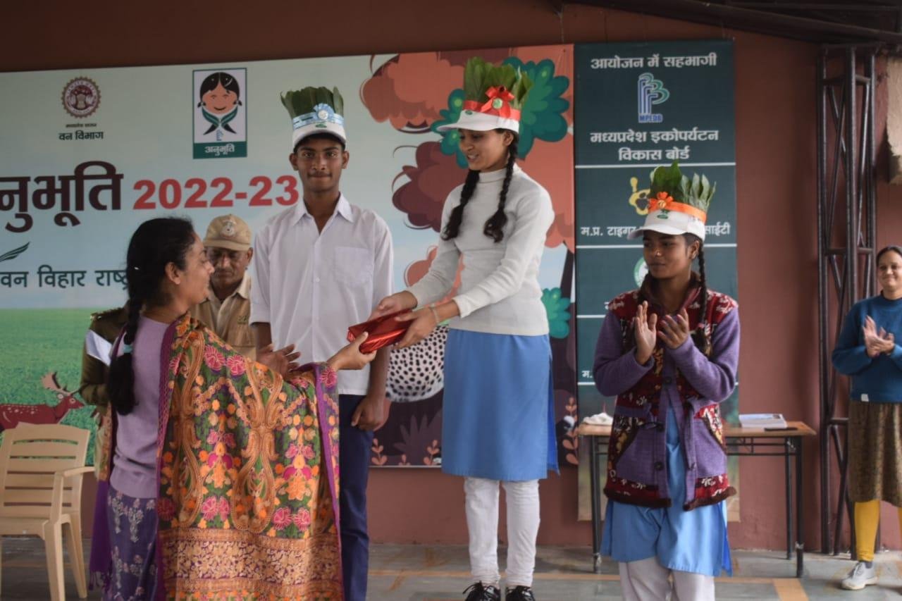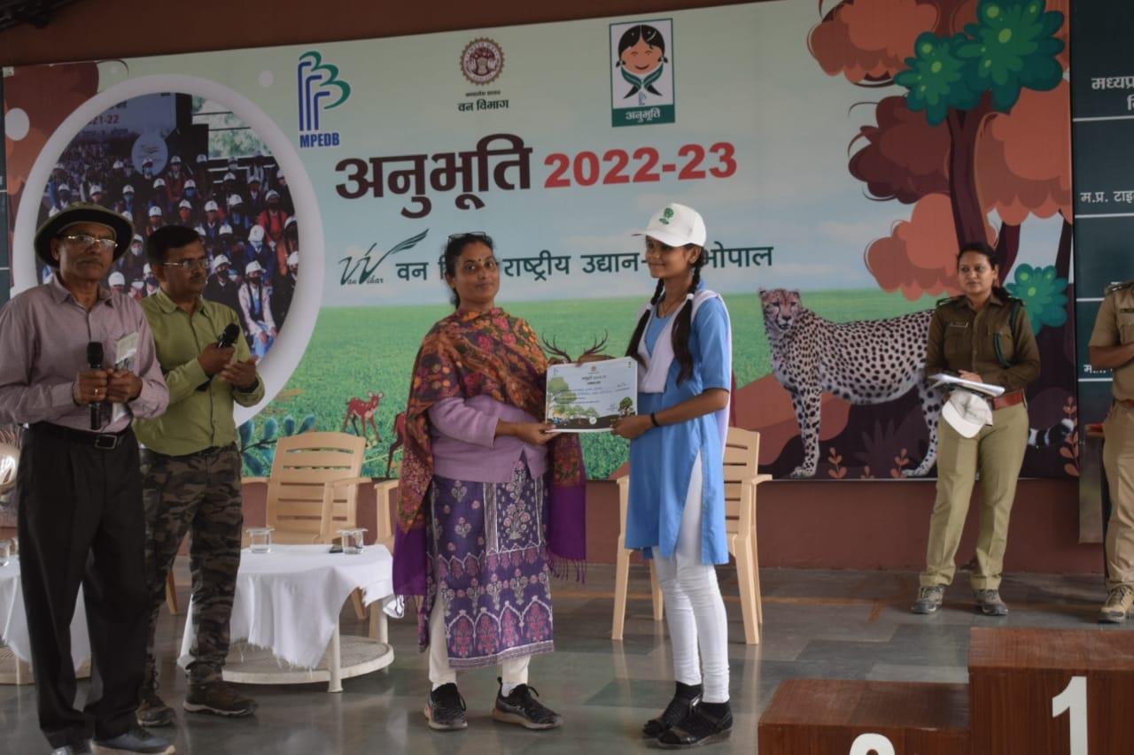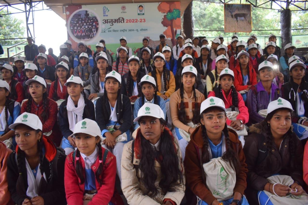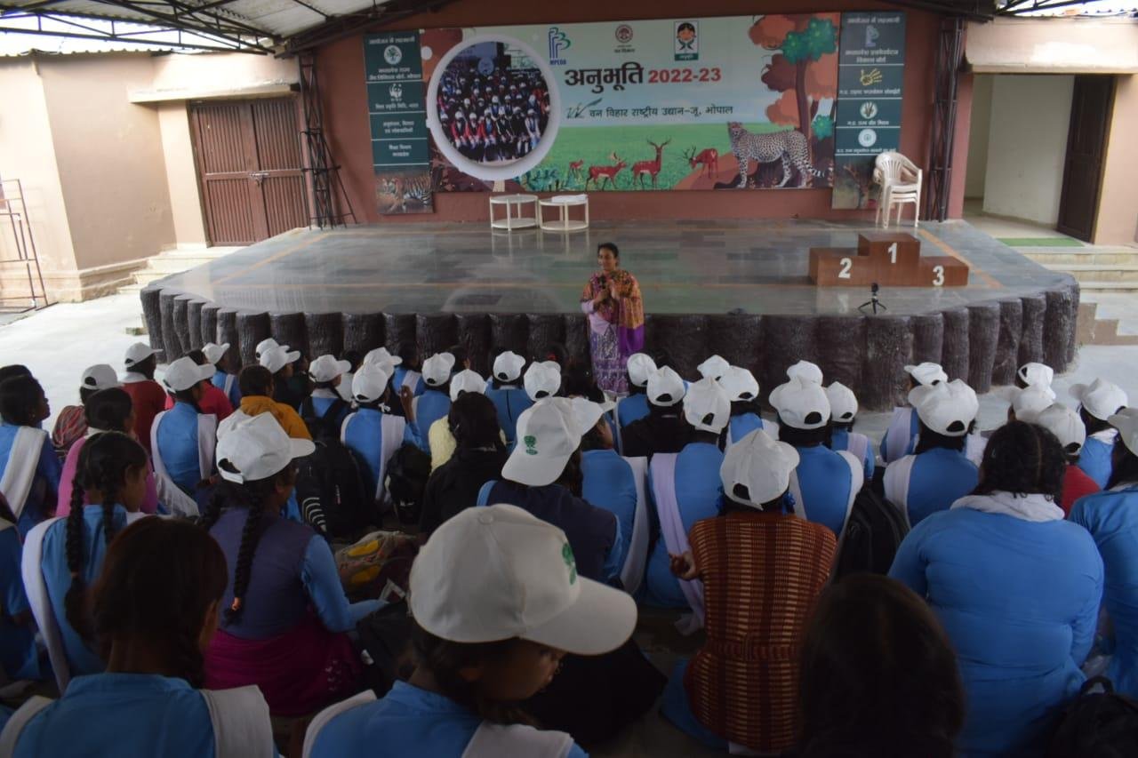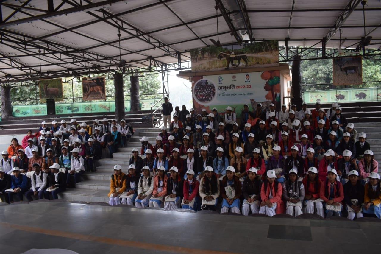 मध्यप्रदेश शासन वन विभाग द्वारा अनुभूति कार्यक्रम 2022-23 के अंतर्गत वन वन्यप्राणी एवं पर्यावरण संरक्षण के प्रति संवेदनशीलता विकसित करने के उद्देश्य से मध्यप्रदेश ईको पर्यटन विकास बोर्ड के समन्वय से आयोजित प्रशिक्षण सह जागरूकता शिविर के अंतर्गत वन विहार राष्ट्रीय उद्यान में आज दिनांक 12.12.2022 को प्रथम शिविर आयोजित किया गया, जिसमें शासकीय नवीन उच्चतर माध्यमिक विद्यालय, बागसेवनिया के कुल 114 विद्यार्थियों ने भाग लिया। उक्त शिविर के आयोजन के प्रमुख उद्देश्य है:- विद्यालयों के विद्यार्थियों अर्थात् भविष्य के नागरिकों को वन, वन्यप्राणी एवं पर्यावारण की अनुभूति कराकर, उन्हें उनके संरक्षण हेतु जागरूक एवं प्रेरित करना, विभाग एवं विभागीय अधिकारियों के कार्यो, उत्तरदायित्वों एवं चुनौतियों से विद्यार्थियों को अवगत कराना तथा माननीय प्रधानमंत्री जी द्वारा Mission LiFE “Lifestyle for Environment” के मूल मंत्रों से विद्यार्थियों को अवगत कराना।