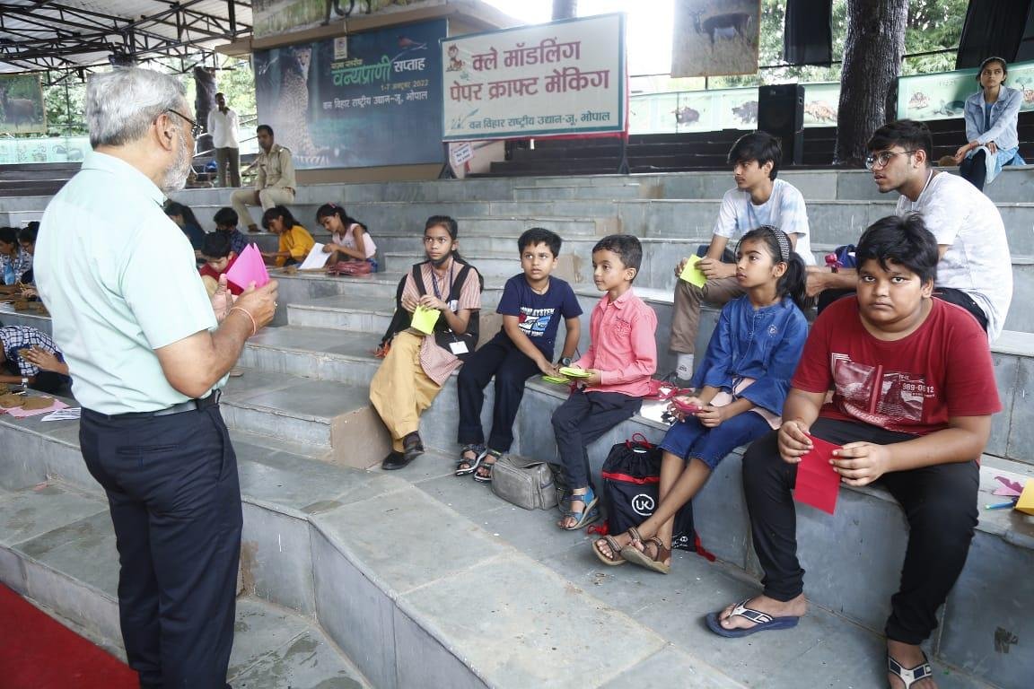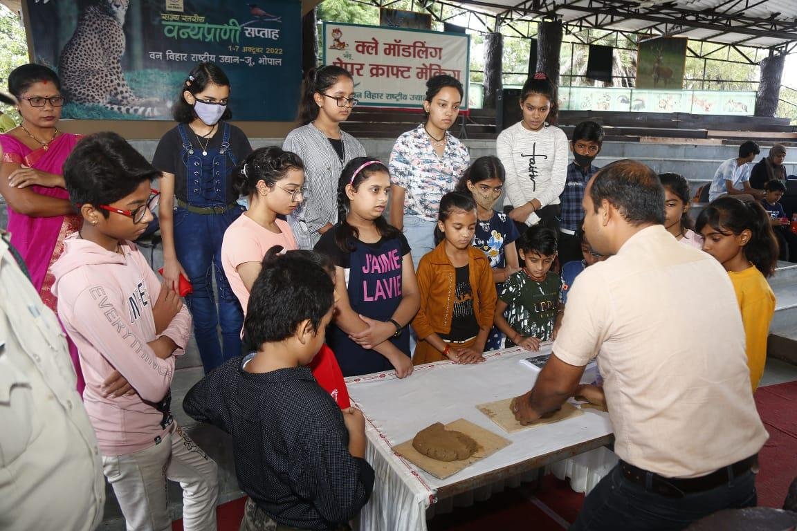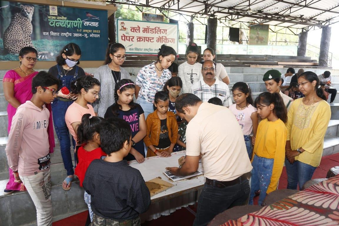 राज्य स्तरीय वन्यप्राणी सप्ताह 2022 के अंतर्गत आज दिनांक 06.10.2022 को वन विहार राष्ट्रीय उद्यान में प्रातः 11.30 बजे से स्कूली बच्चों में जागरूकता के उद्देश्य से सृजनात्मक कार्यशाला का आयोजन किया गया जिसमें विभिन्न विद्यालयों के कुल 30 बच्चों ने भाग लिया। इन विद्यार्थियों को श्री विनय सप्रे, से.नि. शिक्षक जवाहरलाल नेहरू, बाल भवन भोपाल द्वारा रंगीन कागज के माध्यम से विभिन्न पक्षी, तितलियॉं, वन्यप्राणी एवं फूलों की आकृतियॉं बनाना सिखाया गया तथा श्री अरविन्द अनुपम, मूर्तिकार क्षेत्रीय प्राकृतिक विज्ञान संग्रहालय के द्वारा क्ले मॉडलिंग में विद्यार्थियों को चीता बनाना सिखाया गया।
