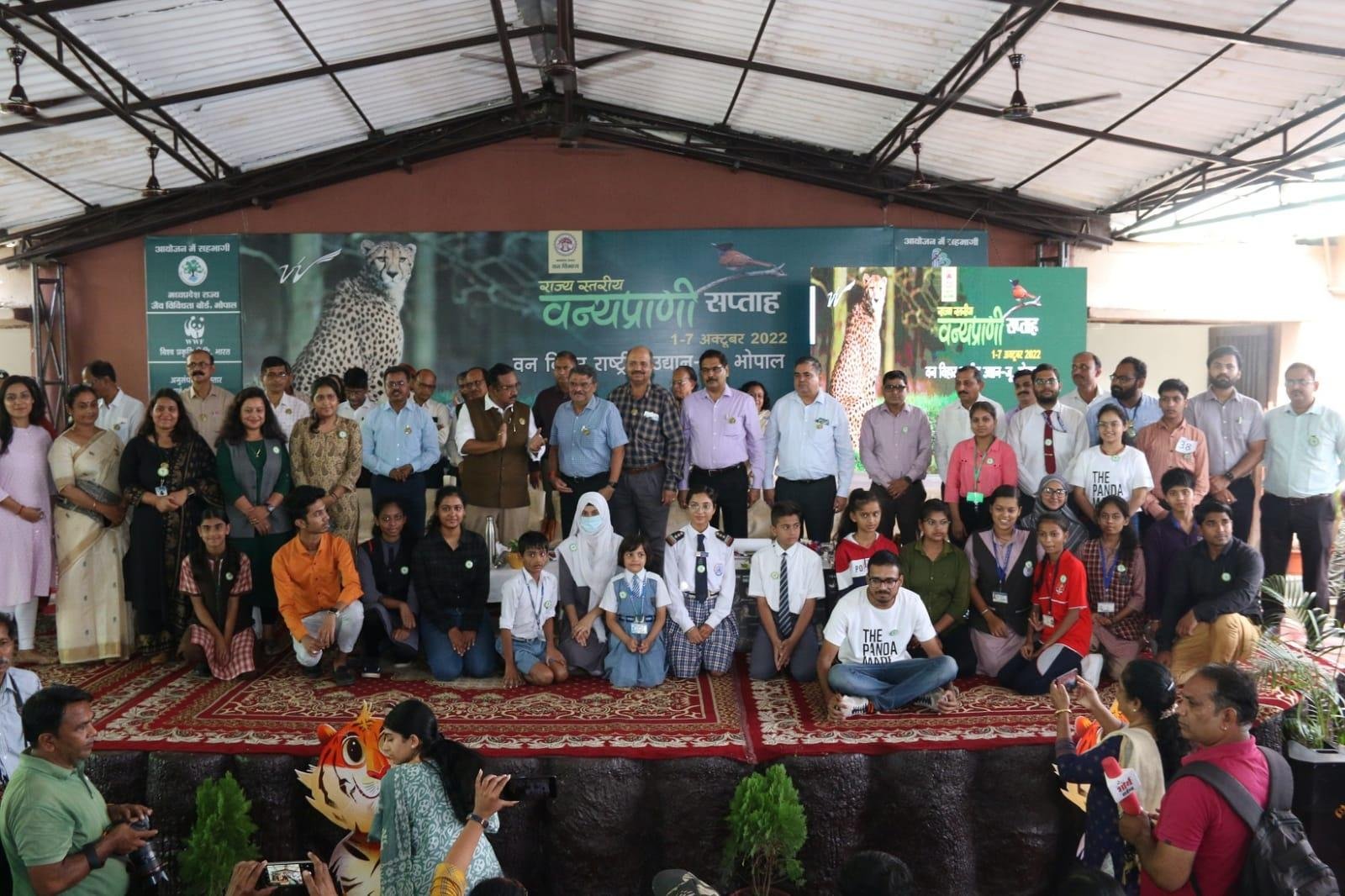 आज दिनांक 07 अक्टूबर को राज्य स्तरीय वन्यप्राणी सप्ताह 2022 का समापन एवं पुरस्कार वितरण समारोह वन विहार राष्ट्रीय उद्यान-जू भोपाल में डॉ. कुॅवर विजय शाह जी, मान्नीय मंत्री, वन, मध्य प्रदेश शासन के मुख्य आतिथ्य में आयोजित किया गया। मुख्य अतिथि द्वारा कार्यक्रम में उपस्थित विद्यार्थियों तथा अधिकारियों/कर्मचारियों को वन्यप्राणी संरक्षण की शपथ दिलाई। इस अवसर पर श्री अशोक बर्णवाल, प्रमुख सचिव, वन, म.प्र. शासन, डॉ. अभय कुमार पाटिल, प्रबंध संचालक, वन विकास निगम, श्री सी.के.पाटिल, प्रधान मुख्य वन संरक्षक (संरक्षण), श्री पुष्कर सिंह, प्रबंध संचालक, लघुवनोपज संघ, श्री अतुल कुमार जैन, प्रधान मुख्य वन संरक्षक (अनु.वि. एवं लो.वा.), श्री असीम श्रीवास्तव, प्रधान मुख्य वन संरक्षक (उत्पादन), श्री चितरंजन त्यागी, प्रधान मुख्य वन सरंक्षक (विकास), डॉं. अतुल श्रीवास्तव,प्रधान मुख्य वन संरक्षक (कार्य आयो. एवं भू अभि.), श्री राकेश कुमार यादव, प्रधान मुख्य वन सरंक्षक (प्रशासन-1), श्री पी.के.सिंह, प्रधान मुख्य वन संरक्षक (मानव संसाधन विकास), श्रीमती संगीता सक्सेना, संचालक विश्व प्रकृति निधि भारत, श्री एस.पी.शर्मा, अपर प्रधान मुख्य वन संरक्षक (समन्वय), डॉ. यू.के. सुबुद्धि, संचालक, म.प्र. राज्य बांस मिशन, श्री सत्यानंद, अपर प्रधान मुख्य वन संरक्षक (वन्यप्राणी), श्रीमती समिता राजोरा, मुख्य कार्यपालन अधिकारी म.प्र. ईको पर्यटन विकास बोर्ड, श्रीमती कमलिका मोहंता, अपर प्रधान मुख्य वन संरक्षक, कार्य आयोजना आंचलिक भोपाल, श्री एच.एस.मोहंता, अपर प्रधान मुख्य वन संरक्षक (प्रशासन-2), श्रीमती पदमप्रिया बालाकृष्णन, संचालक वन विहार राष्ट्रीय उद्यान, डॉ. सुरेन्द्र तिवारी, सदस्य, म.प्र. राज्य वन्यप्राणी बोर्ड, श्री अशोक कुमार, अपर सचिव वन, श्री राजेश खरे, वन संरक्षक भोपाल वृत्त भोपाल, श्रीमती राखी नंदा, वनसंरक्षक सामाजिक वानिकी वृत्त भोपाल, श्री आलोक पाठक, वनमंडलाधिकारी, वन मंडल भोपाल, श्री एस.के.सिन्हा, सहायक संचालक वन विहार एवं अन्य वरिष्ठ अधिकारी तथा सेवा निवृत्त वन अधिकारी तथा बड़ी संख्या में शालाओं के शिक्षक, विद्यार्थीगण, अभिभावक एवं मीडियाकर्मी भी उपस्थित रहे। कार्यक्रम का मंच संचालन श्री ए.के.खरे, सेवा निवृत, उप वन संरक्षक द्वारा किया गया।