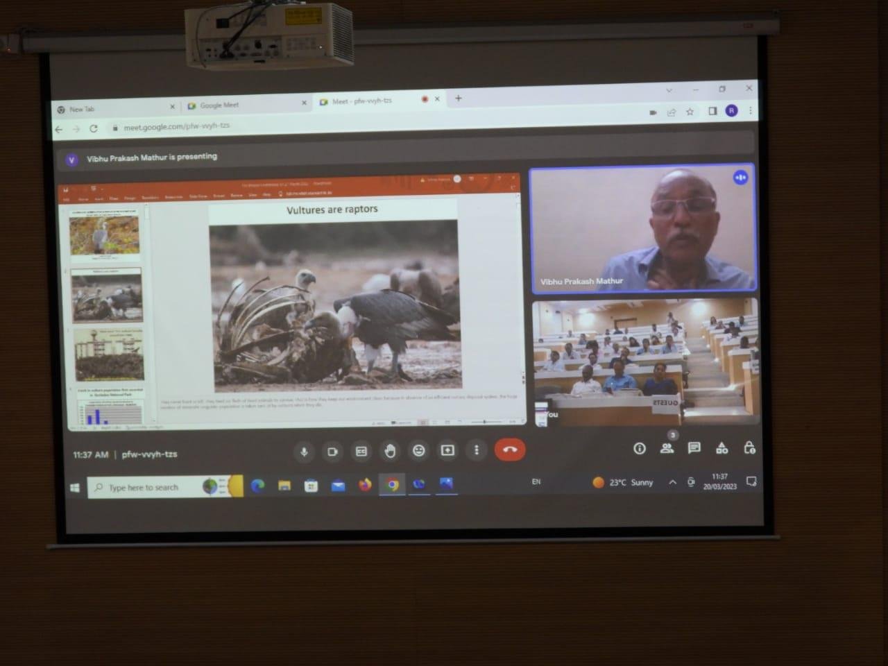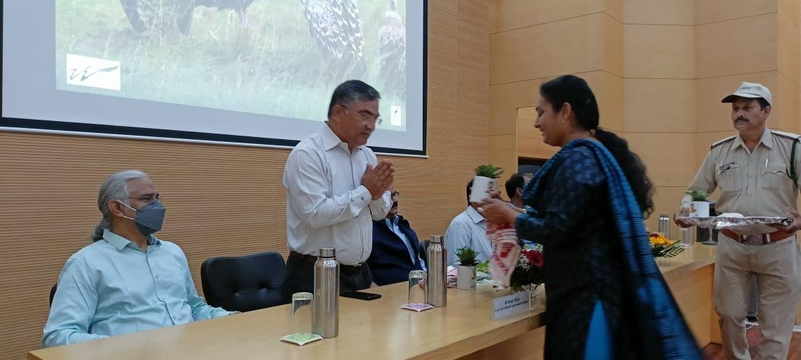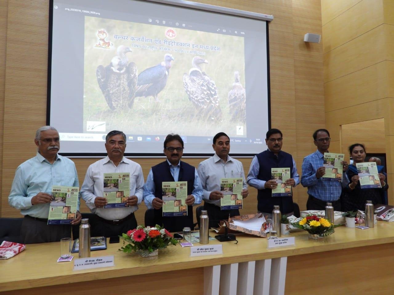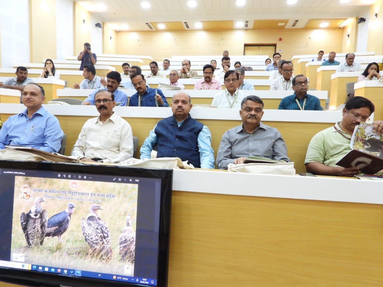 आर.सी.वी.पी. नरोन्हा प्रशासन अकादमी भोपाल में वन विहार राष्ट्रीय उद्यान एवं बॉम्बे नेचुरल हिस्ट्री सोसायटी के सहयोग से मध्य प्रदेश में गिद्धों के संरक्षण एवं पुर्नस्थापना (Vulture Conservation and Reintroduction in Madhya Pradesh) विषय पर दिनांक 20 एवं 21 मार्च 2023 को आयोजित दो दिवसीय राष्ट्रीय स्तर के सम्मेलन का शुभारंभ मुख्य अतिथि श्री जे.एन. कंसोटिया, अपर मुख्य सचिव, वन, म.प्र. शासन द्वारा दीप प्रज्वलित कर किया गया।। इस अवसर पर श्री आर. के. गुप्ता, प्रधान मुख्य वन संरक्षक एवं वन बल प्रमुख म.प्र. डॉ. अभय कुमार पाटिल, प्रबंध संचालक, म.प्र. राज्य वन विकास निगम, श्री पुष्कर सिंह, प्रबंध संचालक. म.प्र. राज्य लघु वनोपज संघ, श्री जे.एस. चौहान, प्रधान मुख्य वन संरक्षक (वन्यप्राणी) एवं मुख्य वन्यप्राणी अभिरक्षक, डॉ. अतुल श्रीवास्तव, प्रधान मुख्य वन संरक्षक (कार्य आयोजना एवं वन भू अभिलेख), श्री राकेश कुमार यादव, प्रधान मुख्य वन सरंक्षक (प्रशासन - 1 ) एवं श्रीमती पदमप्रिया बालाकृष्णन, संचालक वन विहार राष्ट्रीय उद्यान उपस्थित रहीं।