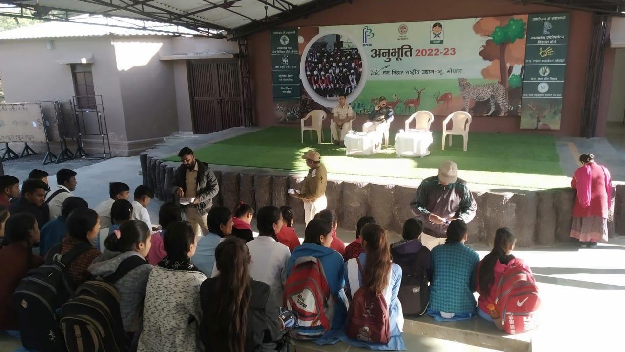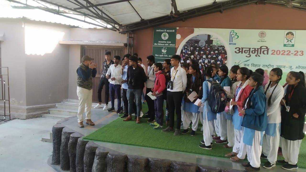 वन विहार राष्ट्रीय उद्यान, जू भोपाल में छात्र - छात्राओं में वन, वन्यप्राणियों एवं पर्यावरण के प्रति जागरूकता तथा प्रकृति संरक्षण के प्रति संवेदनशीलता विकसित करने की दृष्टि से भोपाल शहर एवं उसके आस-पास के ग्रामों के शासकीय विद्यालयों के विद्यार्थियों के लिये एक दिवसीय नेचर कैम्प आयोजित किये जा रहे हैं। इसी क्रम में आज दिनांक 21.02.2023 को शासकीय उच्चतर माध्यमिक विद्यालय खजूरीकला भोपाल के 40 विद्यार्थियों ने उक्त नेचर कैम्प में भाग लिया। कार्यक्रम में स्रोत व्यक्ति रूप में डॉ. एस. आर. वाघमारे, से.नि. उप वनसंरक्षक उपस्थित रहे। विषय विशेषज्ञों द्वारा प्रतिभागियों को पक्षी दर्शन, तितली, वन्यप्राणी दर्शन, फिल्म शो, स्थल पर विद्यमान वानिकी गतिविधियों की जानकारी, वन, वन्यप्राणी व पर्यावरण से संबंधित रोचक गतिविधियाँ कराई गई एवं जानकारी प्रदान कर उनकी जिज्ञासाओं को शांत किया गया। इसके अतिरिक्त बाघ, तेंदुआ, भालू, मगर, घड़ियाल, चीतल, सांभर, नीलगाय आदि वन्यप्राणियों का भी अवलोकन किया। इस दौरान संचालक वन विहार श्रीमती पदमाप्रिया बालाकृष्णन, सहायक संचालक वन विहार श्री एस. के. सिन्हा एवं अन्य अधिकारी कर्मचारी उपस्थित रहे। आगामी कैम्प दिनांक 28.02.2023 को आयोजित किया जायेगा, जिसमें शासकीय हाई स्कूल बरखेड़ा पठानी भोपाल के विद्यार्थी भाग लेंगे।