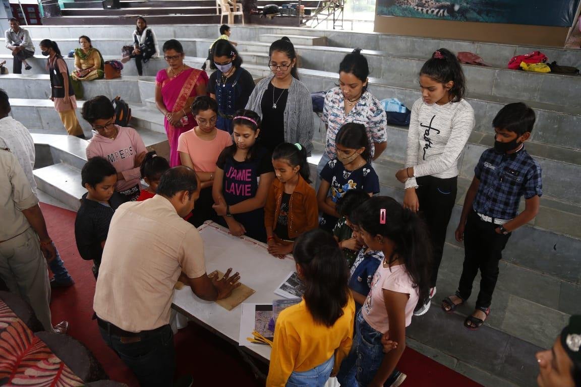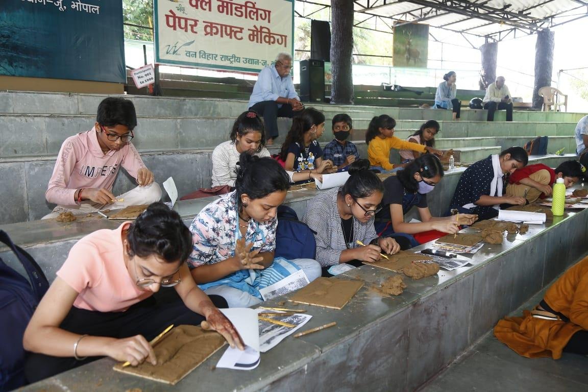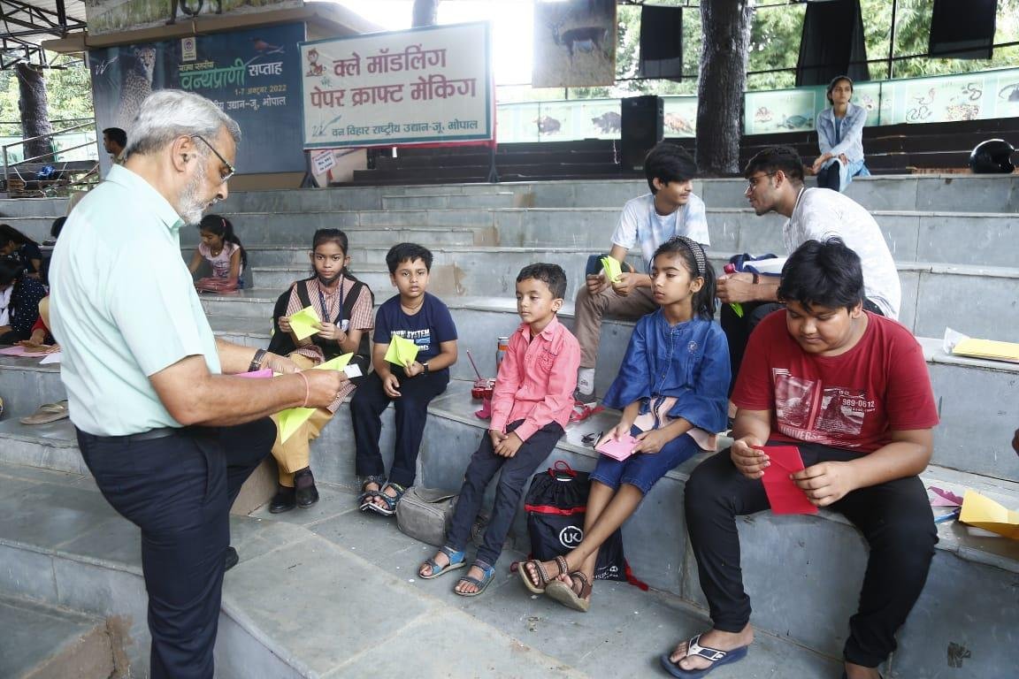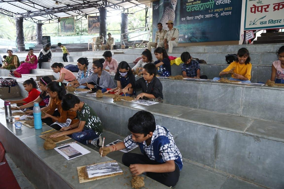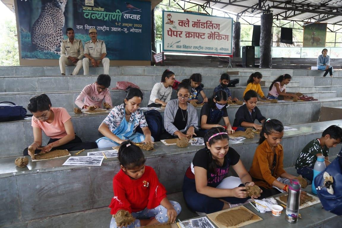 राज्य स्तरीय वन्यप्राणी सप्ताह 2022 के अंतर्गत आज दिनांक 06.10.2022 को वन विहार राष्ट्रीय उद्यान में प्रातः 11.30 बजे से स्कूली बच्चों में जागरूकता के उद्देश्य से सृजनात्मक कार्यशाला का आयोजन किया गया जिसमें विभिन्न विद्यालयों के कुल 30 बच्चों ने भाग लिया। इन विद्यार्थियों को श्री विनय सप्रे, से.नि. शिक्षक जवाहरलाल नेहरू, बाल भवन भोपाल द्वारा रंगीन कागज के माध्यम से विभिन्न पक्षी, तितलियॉं, वन्यप्राणी एवं फूलों की आकृतियॉं बनाना सिखाया गया तथा श्री अरविन्द अनुपम, मूर्तिकार क्षेत्रीय प्राकृतिक विज्ञान संग्रहालय के द्वारा क्ले मॉडलिंग में विद्यार्थियों को चीता बनाना सिखाया गया।