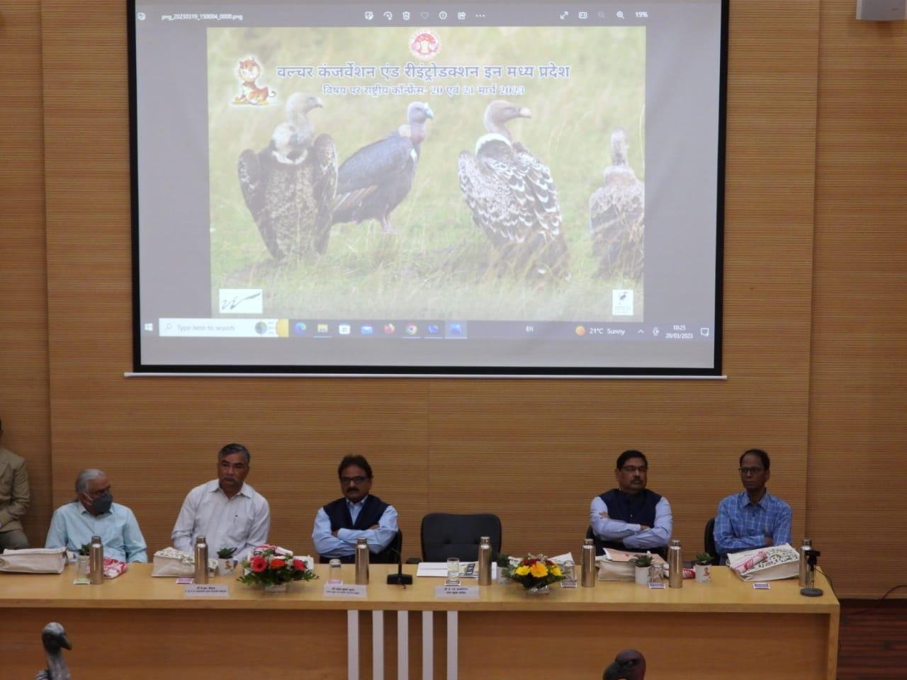 आर.सी.वी.पी. नरोन्हा प्रशासन अकादमी भोपाल में वन विहार राष्ट्रीय उद्यान एवं बॉम्बे नेचुरल हिस्ट्री सोसायटी के सहयोग से मध्य प्रदेश में गिद्धों के संरक्षण एवं पुर्नस्थापना (Vulture Conservation and Reintroduction in Madhya Pradesh) विषय पर दिनांक 20 एवं 21 मार्च 2023 को आयोजित दो दिवसीय राष्ट्रीय स्तर के सम्मेलन का शुभारंभ मुख्य अतिथि श्री जे.एन. कंसोटिया, अपर मुख्य सचिव, वन, म.प्र. शासन द्वारा दीप प्रज्वलित कर किया गया।। इस अवसर पर श्री आर. के. गुप्ता, प्रधान मुख्य वन संरक्षक एवं वन बल प्रमुख म.प्र. डॉ. अभय कुमार पाटिल, प्रबंध संचालक, म.प्र. राज्य वन विकास निगम, श्री पुष्कर सिंह, प्रबंध संचालक. म.प्र. राज्य लघु वनोपज संघ, श्री जे.एस. चौहान, प्रधान मुख्य वन संरक्षक (वन्यप्राणी) एवं मुख्य वन्यप्राणी अभिरक्षक, डॉ. अतुल श्रीवास्तव, प्रधान मुख्य वन संरक्षक (कार्य आयोजना एवं वन भू अभिलेख), श्री राकेश कुमार यादव, प्रधान मुख्य वन सरंक्षक (प्रशासन - 1 ) एवं श्रीमती पदमप्रिया बालाकृष्णन, संचालक वन विहार राष्ट्रीय उद्यान उपस्थित रहीं।
