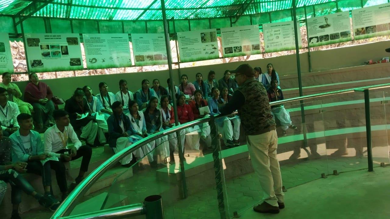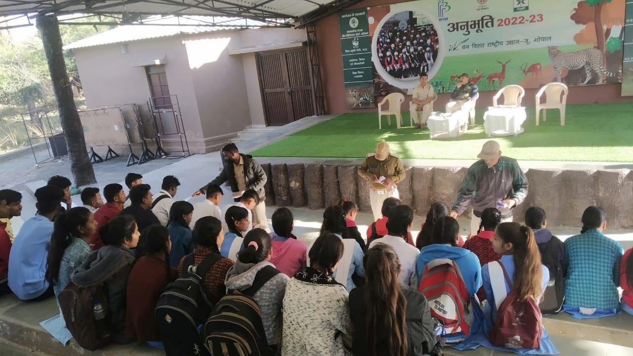 वन विहार राष्ट्रीय उद्यान, जू भोपाल में छात्र - छात्राओं में वन, वन्यप्राणियों एवं पर्यावरण के प्रति जागरूकता तथा प्रकृति संरक्षण के प्रति संवेदनशीलता विकसित करने की दृष्टि से भोपाल शहर एवं उसके आस-पास के ग्रामों के शासकीय विद्यालयों के विद्यार्थियों के लिये एक दिवसीय नेचर कैम्प आयोजित किये जा रहे हैं। इसी क्रम में आज दिनांक 21.02.2023 को शासकीय उच्चतर माध्यमिक विद्यालय खजूरीकला भोपाल के 40 विद्यार्थियों ने उक्त नेचर कैम्प में भाग लिया। कार्यक्रम में स्रोत व्यक्ति रूप में डॉ. एस. आर. वाघमारे, से.नि. उप वनसंरक्षक उपस्थित रहे। विषय विशेषज्ञों द्वारा प्रतिभागियों को पक्षी दर्शन, तितली, वन्यप्राणी दर्शन, फिल्म शो, स्थल पर विद्यमान वानिकी गतिविधियों की जानकारी, वन, वन्यप्राणी व पर्यावरण से संबंधित रोचक गतिविधियाँ कराई गई एवं जानकारी प्रदान कर उनकी जिज्ञासाओं को शांत किया गया। इसके अतिरिक्त बाघ, तेंदुआ, भालू, मगर, घड़ियाल, चीतल, सांभर, नीलगाय आदि वन्यप्राणियों का भी अवलोकन किया। इस दौरान संचालक वन विहार श्रीमती पदमाप्रिया बालाकृष्णन, सहायक संचालक वन विहार श्री एस. के. सिन्हा एवं अन्य अधिकारी कर्मचारी उपस्थित रहे। आगामी कैम्प दिनांक 28.02.2023 को आयोजित किया जायेगा, जिसमें शासकीय हाई स्कूल बरखेड़ा पठानी भोपाल के विद्यार्थी भाग लेंगे।