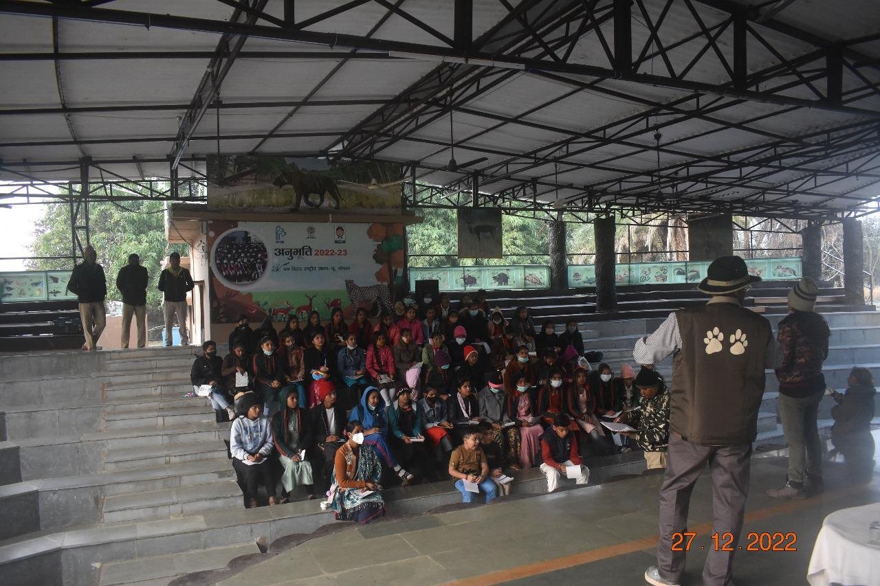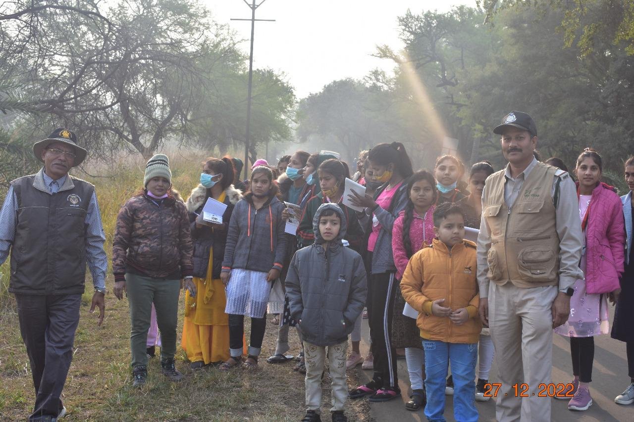 वन विहार राष्ट्रीय उद्यान, जू भोपाल में छात्र - छात्राओं में वन, वन्यप्राणियों एवं पर्यावरण के प्रति जागरूकता तथा प्रकृति संरक्षण के प्रति संवेदनशीलता विकसित करने की दृष्टि से भोपाल शहर एवं उसके आस-पास के ग्रामों के शासकीय विद्यालयों के विद्यार्थियों के लिये एक दिवसीय नेचर कैम्प आयोजित किये जा रहे हैं। इसी क्रम में आज दिनांक 27.12.2022 को शासकीय नवीन कन्या उच्चतर माध्यमिक विद्यालय तुलसी नगर के 54 विद्यार्थियों ने उक्त नेचर कैम्प में भाग लिया। कार्यक्रम में स्रोत व्यक्ति रूप में श्री ए. के. खरे, सेवा निवृत उप वन संरक्षक तथा पक्षीविद के रूप में डॉ. संगीता राजगीर तथा मो. खालिक भोपाल बर्ड्स भोपाल उपस्थित रहे । विषय विशेषज्ञों द्वारा प्रतिभागियों को पक्षी दर्शन, वन्यप्राणी दर्शन, फिल्म शो, स्थल पर विद्यमान वानिकी गतिविधियों की जानकारी, वन, वन्यप्राणी व पर्यावरण से संबंधित रोचक गतिविधियॉ कराई गई एवं जानकारी प्रदान कर उनकी जिज्ञासाओं को शांत किया गया। भ्रमण के दौरान प्रतिभागियों ने विभिन्न प्रजातियों का दर्शन किये जिसमें प्रमुख है ग्रीन बी ईटर, टिटहरी, पोंड हेरोन, रेड मुनिया, इग्रेट, मेग पाई राबिन, मूरहैन, ड्रोंगो, ब्रोंज विंग जकाना, किंगफिशर, विहिस्लिंग टील्सकार्मोरेंट, सिल्वर बिल मुनिया आदि । तितलियों में ब्लू टाईगर, क्रीमसन रोज, ग्रे पेनसी, प्लेन टाईगर, कॉमन ईवनिंग ब्राउन, कॉमन ग्रास यलो आदि को देखकर प्रतिभागी उत्साहित हो उठे। इसके अतिरिक्त बाघ, तेंदुआ, भालू, मगर, घड़ियाल, चीतल, सांभर, नीलगाय, सरीसर्प आदि वन्यप्राणियों का भी अवलोकन किया। इस दौरान संचालक वन विहार श्रीमती पदमप्रिया बालाकृष्णन एवं अन्य अधिकारी कर्मचारी भी उपस्थित रहे। कैम्प का संचालन सहायक संचालक वन विहार श्री सुनील कुमार सिन्हा द्वारा किया गया।